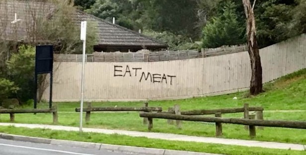 Megan’s upgraded “EAT MEAT” slogan received popular acclaim from passing motorists before recently being painted over, presumably by the council or the residents who live on the other side of the fence. Or, who knows, maybe the vegans are preparing to return fire on the now blank canvas. Only time will tell…