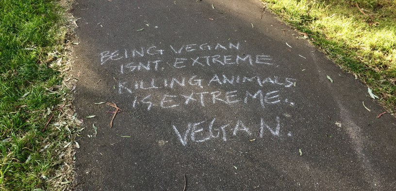 The slogan, scrawled over the footpath, reads “BEING VEGAN ISN’T EXTREME, KILLING ANIMALS IS EXTREME” and then signs off simply with “VEGAN”. Ignoring the odd sign-off for a second, the slogan suggests that like an canny military strategist, the leader of the vegans has conceded the frontline of St Helena Road, and is now establishing a new foothold in the streets of Eltham.