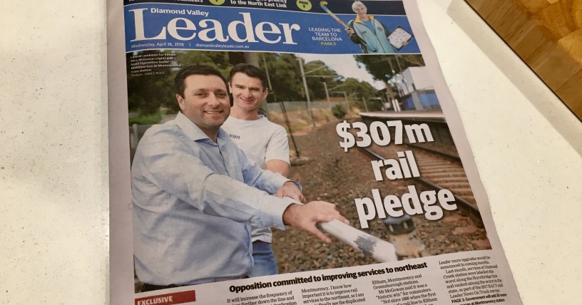 A prominent state politician has been photographed in Montmorency awkwardly grasping a fence railing and pretending to be your friend in what can only be interpreted as a grab for votes. The photograph, which appears on the front cover of this week’s edition of the DV Leader, features opposition leader Matthew Guy promoting his promise to finally give Montmorency Train Station the two platforms that pretty much every other station in the state already has.