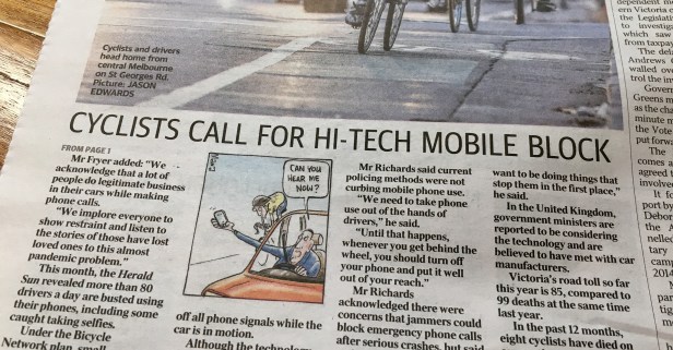 Despite struggling to take a definitive view on the age-old debate of the viability of having cyclists on the road, you can’t help but be impressed by the Herald Sun’s ability to spin the view of one person into a full-blown “VEHICLES v BIKES” headline that effectively pitches every single motorist against every single person on a bike in the entirety of Melbourne. While they acknowledged that a recent report claims that “texting, web browsing and other such phone use by drivers will help push Victoria’s annual road toll to 329 by 2030, up from 258 last year”, they obviously couldn’t resist the urge to turn the findings into yet another rehash of the well-worn turf war on our roads, rather than actually tackling the issue of phone use amongst drivers.