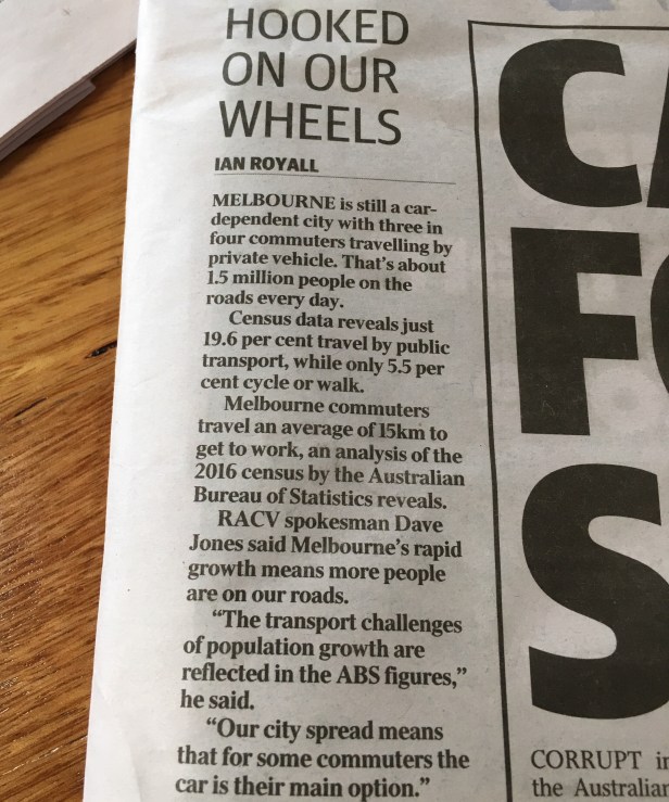 While this anti-cyclist position is hardly surprising coming from the Herald Sun, it seems to have confused some readers who only yesterday read the same newspaper bemoaning the fact that “only 5.5%” of Melbourne’s commuters either ride a bike or walk to work – a statistic given in the context of a wider report complaining about increased congestion on our roads: