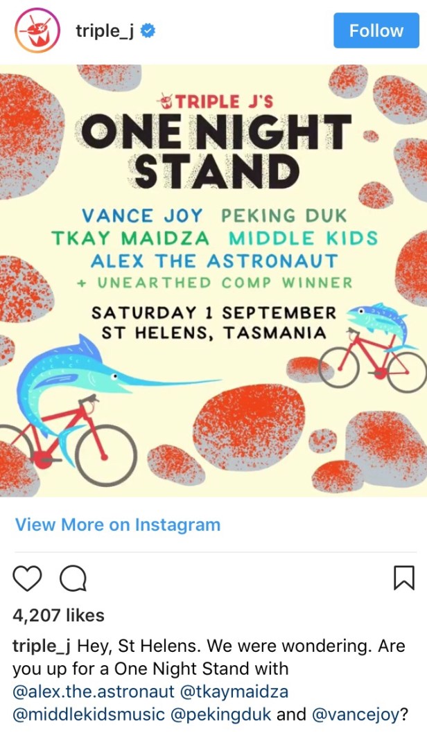 A St Helena resident has mis-read yesterday’s announcement of the venue for Triple J’s coveted One Night Stand and gotten momentarily excited before realising they’d made an error of judgement. The annual One Night Stand involves towns and suburbs around Australia pitching for the right to host a one-off concert with some of the country’s hottest young acts, then Triple J announces the winner with much pomp and ceremony.