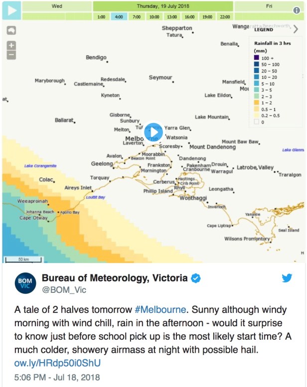 Following Tuesday’s deluge right on knock off time for Melbourne’s school students, heavy rain is again expected to lash our local area from around 3.00pm today. So concerned about the implications of this extreme weather at the exact time students leave their classrooms for the day that the Bureau of Meteorology mentioned it in the tweet below warning residents of wet conditions.