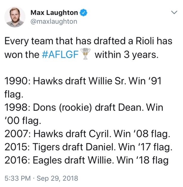 All of the 18 AFL clubs have reportedly commenced scouring the nation for a suitable Rioli to recruit to their club, given the incredible impact they are having on club success. West Coast’s premiership win yesterday against Collingwood, featuring Willie Rioli, is now the fifth reported case in just 27 years of a Rioli recruitment leading to a premiership victory within three years of said recruitment.