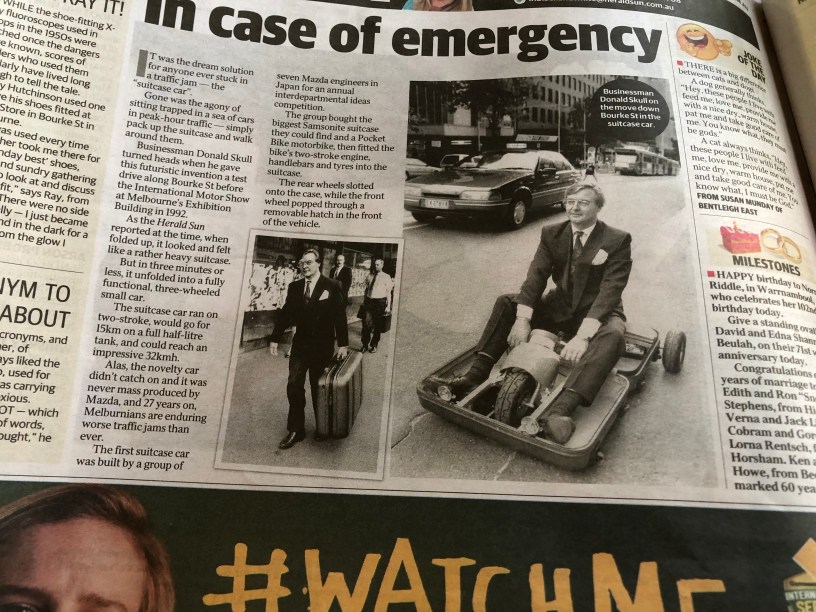 After flicking through a prominent Melbourne newspaper yesterday, a local man claims to have discovered a potential solution for the daily Watsonia Train Station car parking riddle. Vinnie Robinson was flicking through the Herald Sun yesterday when he spotted an article that shared the concept of a so-called “Suitcase Car”, last seen plodding along Bourke Street in 1992 as part of a promotion for that year’s International Motor Show.