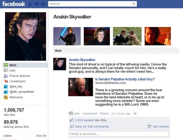 Vader’s first social media account dates back as far as the Myspace days when a young Anakin leveraged his sublime tech skills to create an account despite being a lowly slave on the planet Tatooine. His bio on that account reads: “I’m a slave boy from Tatooine, but it’s not all bad. I’m really into pod racing and I’m pretty good at it too. When I’m not tinkering with my racer, being a slave, wondering who my dad is, or shielding myself from my planet’s two suns, I’m building droids from scratch in my bedroom. I live at home with my mum, and I love her very much. Sebulba is a doo-doo head.”