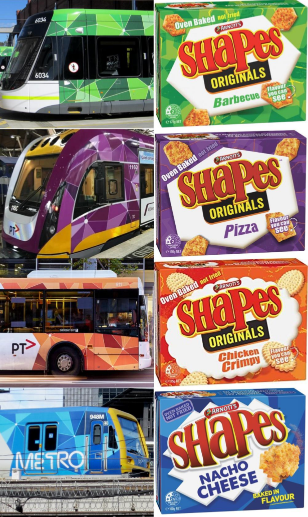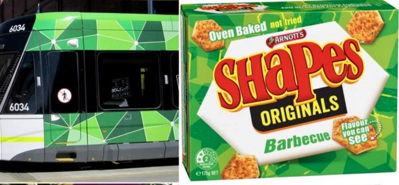 As seen below, an image posted on Twitter by @danielbowen has laid bare just how closely our various trams, trains and buses resemble different flavours of Arnott’s Shapes.