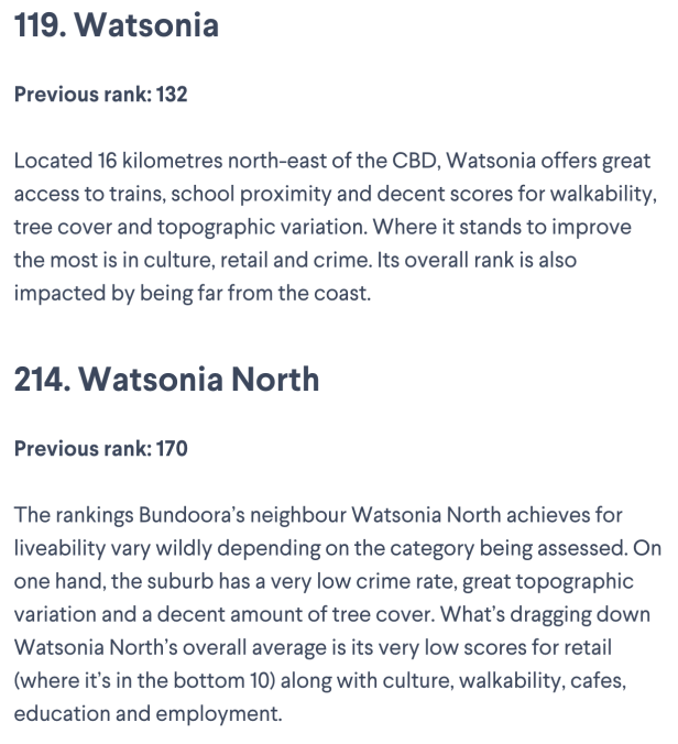 Both Watsonia and Watsonia North have tragically failed to make the top 100 most liveable Melbourne suburbs list according to some bullshit study. Results from the so-called Domain Liveable Melbourne study were announced late last week, with Watsonia sitting at a lowly 119 out of 307, and Watsonia North shunted down to 214.