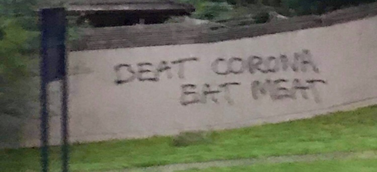 After almost two full years of silence, the Diamond Valley’s most passionate anti-vegan has spoken out about the current COVID-19 crisis. Grainy images have emerged this morning of a new slogan scrawled on the famous Briar Hill fence, telling locals to “BEAT CORONA. EAT MEAT.”