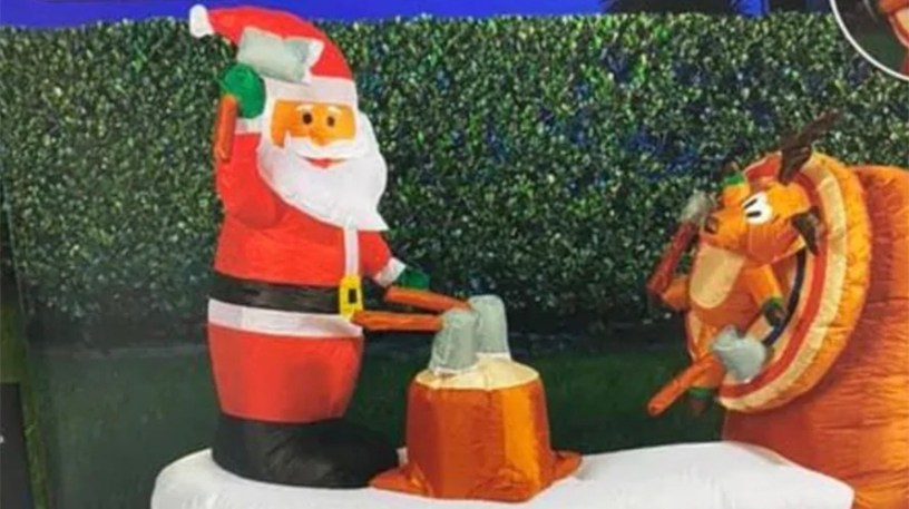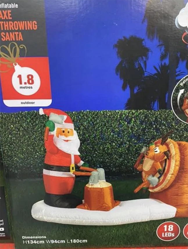 An inflatable axe-throwing Santa decoration that depicts Saint Nick hurling hatchets at a reindeer that is strapped to a rotating bullseye target has been… umm… axed. The item, which had been available at Bunnings until it was recently removed from shelves, was retrospectively deemed inappropriate by the hardware chain, putting local Clark Griswold wannabes back on the search for something a bit different for this year’s Christmas lights.
