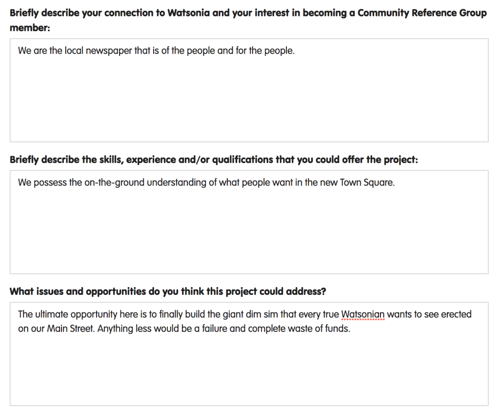The Watsonia Bugle has finally taken a meaningful step towards getting the giant dim sim built on Watsonia Road, after we nominated ourselves to join new Town Square reference group. Nominations to join the advisory group are open until Friday 5 March, and we feel we put together a fairly compelling application.