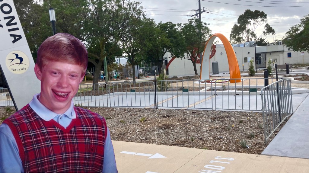 The precocious genius that designed Watsonia’s long-awaited town square has most definitely forgotten to include a fence around the playground that he decided to instal right next to a busy road. While some Watsonians have expressed relief and excitement about the recent soft opening of the town square on the east side of Watsonia Road, more than one have also noticed the shabby-looking temporary fencing behind the iconic slanted Watsonia Library sign.